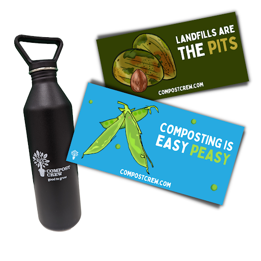 Get your Compost Crew merchandise from our shop! We have fun stickers, Compost Crew water bottles, and Compost Crew clothing to help you show your support for composting.